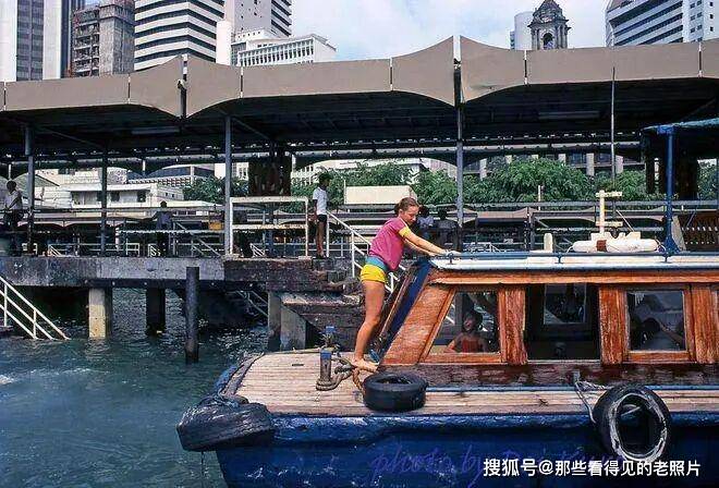 新加坡克利福德码头的一艘蓝底木质的新加坡河 “bumboat”,这类船最初用于货物运输,70 年代末逐渐转型为观光渡船,木质结构与轮胎防撞设计充满复古质感。身着亮色休闲装的西方女孩站在船头,船舱内还有孩童乘客,体现了当时新加坡河已成为热门观光线路,外国游客是主要客群之一。