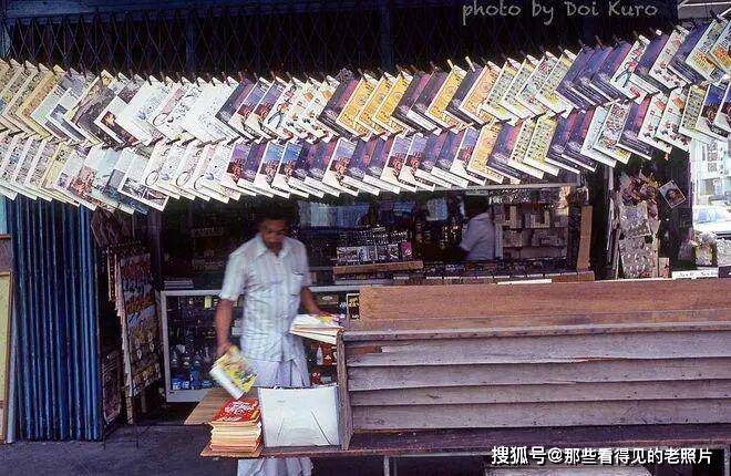 人行道上的报摊,挂着串在绳子上的杂志。摊位上方用夹子悬挂着大量杂志与报刊,色彩丰富、种类繁多,下方木桌堆叠着书籍与刊物,是当时东南亚街头典型的报刊售卖形式,方便路人快速浏览选购。