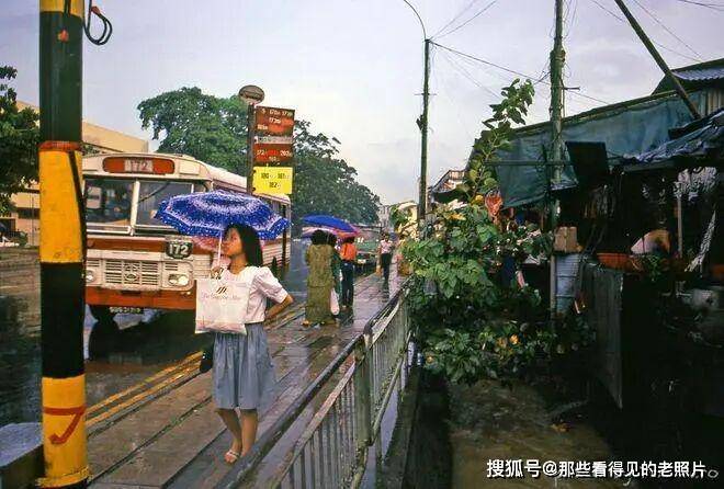 女孩走过一个公共汽车站,打着一把小雨伞。画面左侧是当时新加坡主力运营的老式红白巴士,编号 172,车牌为,旁边的公交站牌清晰标注了多条线 等),反映了当时新加坡公共交通的网络布局。