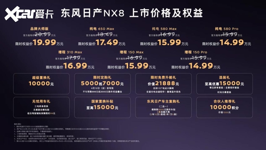 上市权益八重礼同步公布,包括超级置换礼:4月30日前下订直减10000元,叠加优惠后,东风日产NX8上市限时权益价为14.99-17.49万元;限时定购礼:4月12日前支付5000元定金可抵7000元;限时免费升舱礼:免费赠送后排133°电动大躺椅、全遮光电动遮阳帘、墨海蓝外观色;选装礼:零压舒享套装、全景视听套装、时尚光幕套装,限时超低价;以及无忧用车礼、国家置换补贴、东风日产车主复购礼、合伙人推荐礼等。