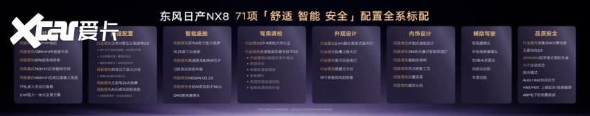 发布会上,东风日产宣布NX8全系标配71项高价值配置,在舒适、智能、安全三大维度,实现合资首个“入门即满配”。