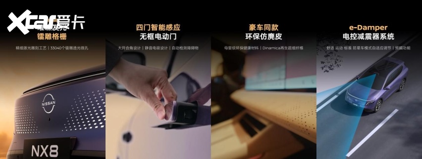 东风日产NX8品牌大师版搭载同级唯一的璀璨发光镭雕格栅,33040个镭雕透光微孔,点亮即艺术品;四门配备智能感应无框电动门,轻按即可开关,同时还能实时探测后方来物,安全实用;环保仿麂皮内饰,豪华车同款,质感与环保兼得;e-Damper电控减震器系统,带预瞄功能,毫秒级调节阻尼,将舒适调校发挥到极致。