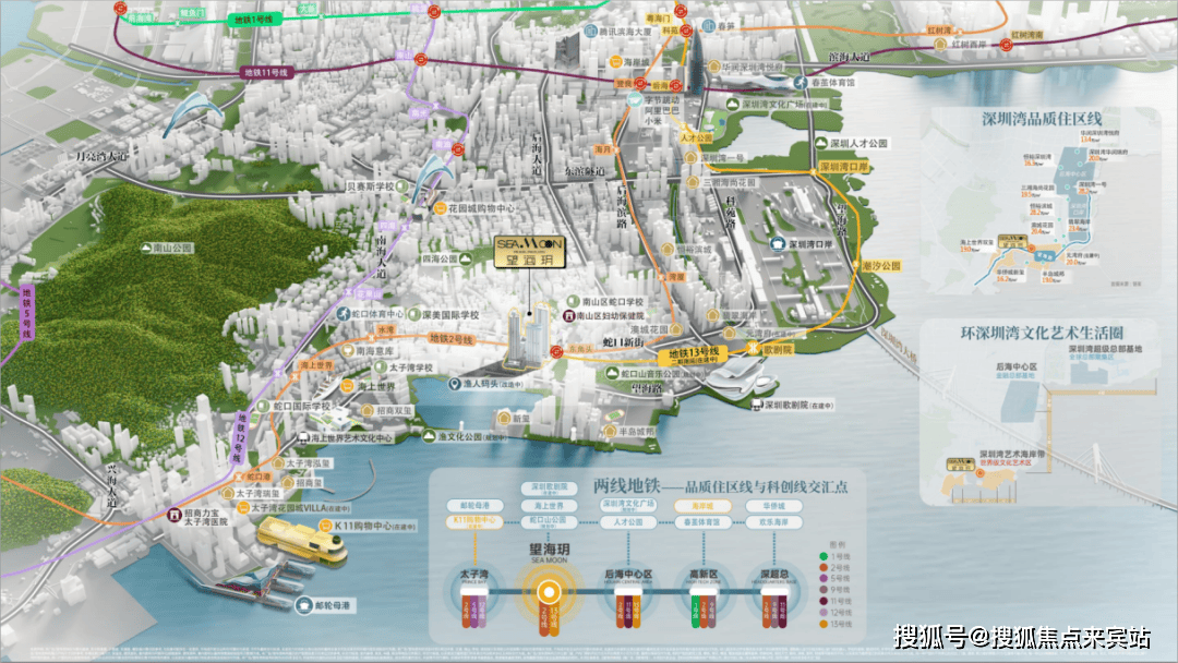 望海玥步行几分钟就可达2号地铁线站后海。预计今年底,13号线二期南延段建成通车,1站地铁直达建设中的深圳歌剧院,3站接驳深圳湾口岸,届时将一线承接港客北上的流量。
