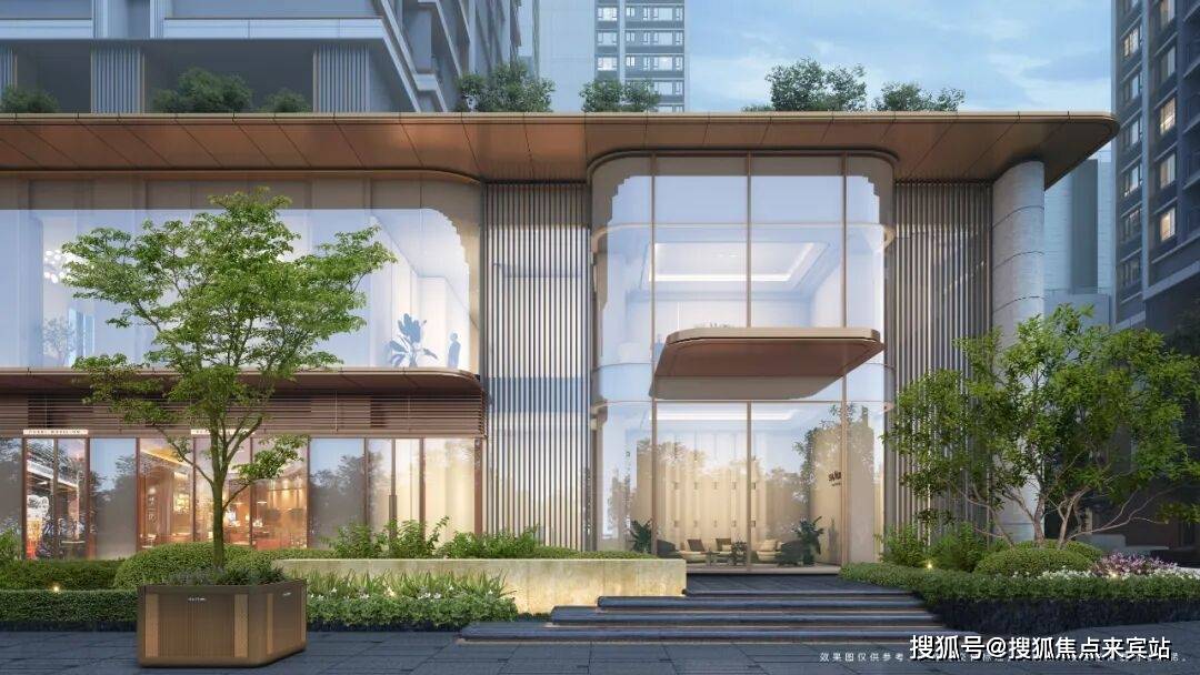 项目采用公建化立面,通过简洁现代的线条配合玻璃展现出极简风格,大堂做到约5.4米挑高,且大面积运用米欧米黄石材,将居者的品位象征和审美价值尽显无疑。